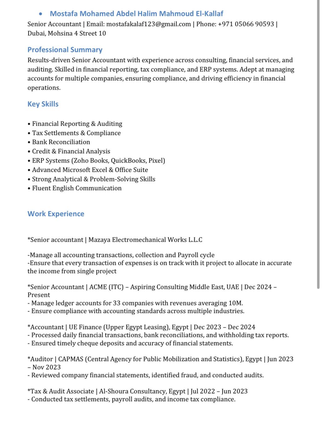 I am Mostafa, Financial Accountant and Tax Specialist offering comprehensive accounting services, including VAT and corporate tax return filing, financial statement preparation, year - end closing, bookkeeping, and tax compliance reviews. I have 3 years of experience in the UAE market with a strong focus on and adherence to local regulations. Available for individuals and businesses