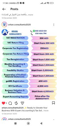 Looking for a reliable accounting partner to manage your finances with professionalism Arkan Al Riyadah provides comprehensive accounting and tax solutions that support your business and ensure full compliance with UAE regulations. Our services include Bookkeeping and financial record management Preparation of financial reports and statements with performance analysis VAT return preparation and follow