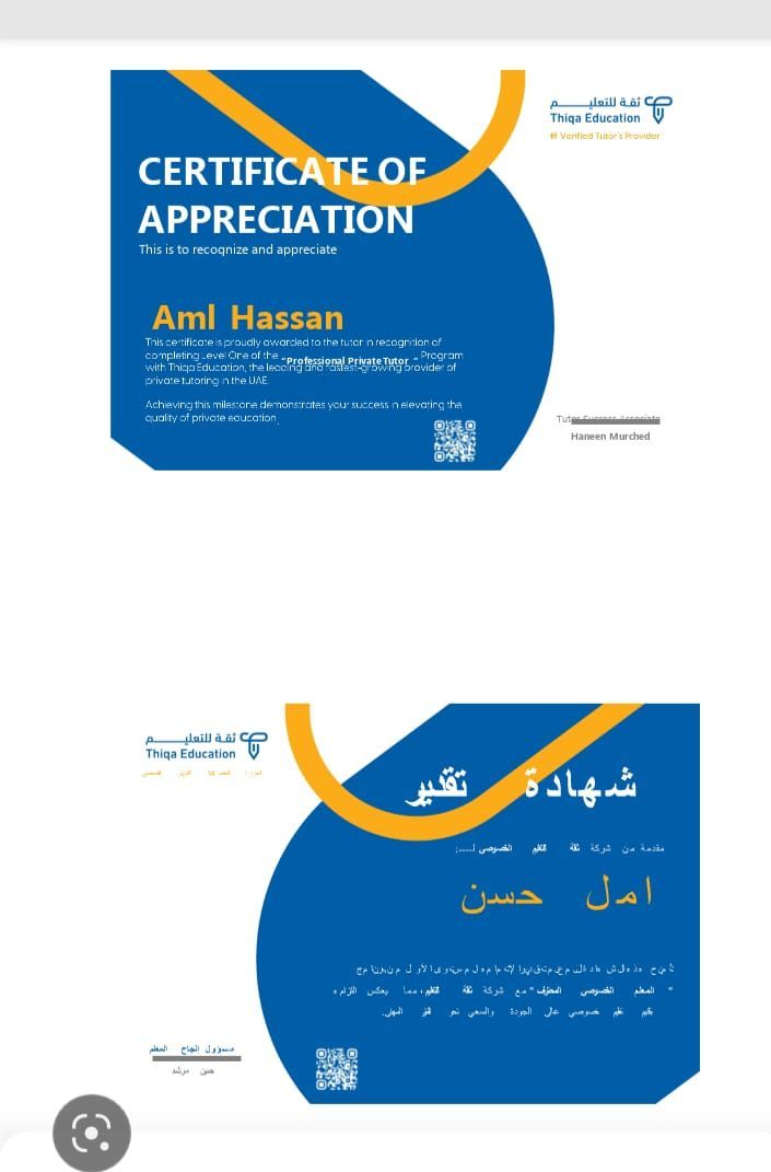 معلمة تأسيس وعملت كشادو تيتشر في دبي اسكول وخبرة بتدريس المواد والتأسيس واللغة الانجليزية