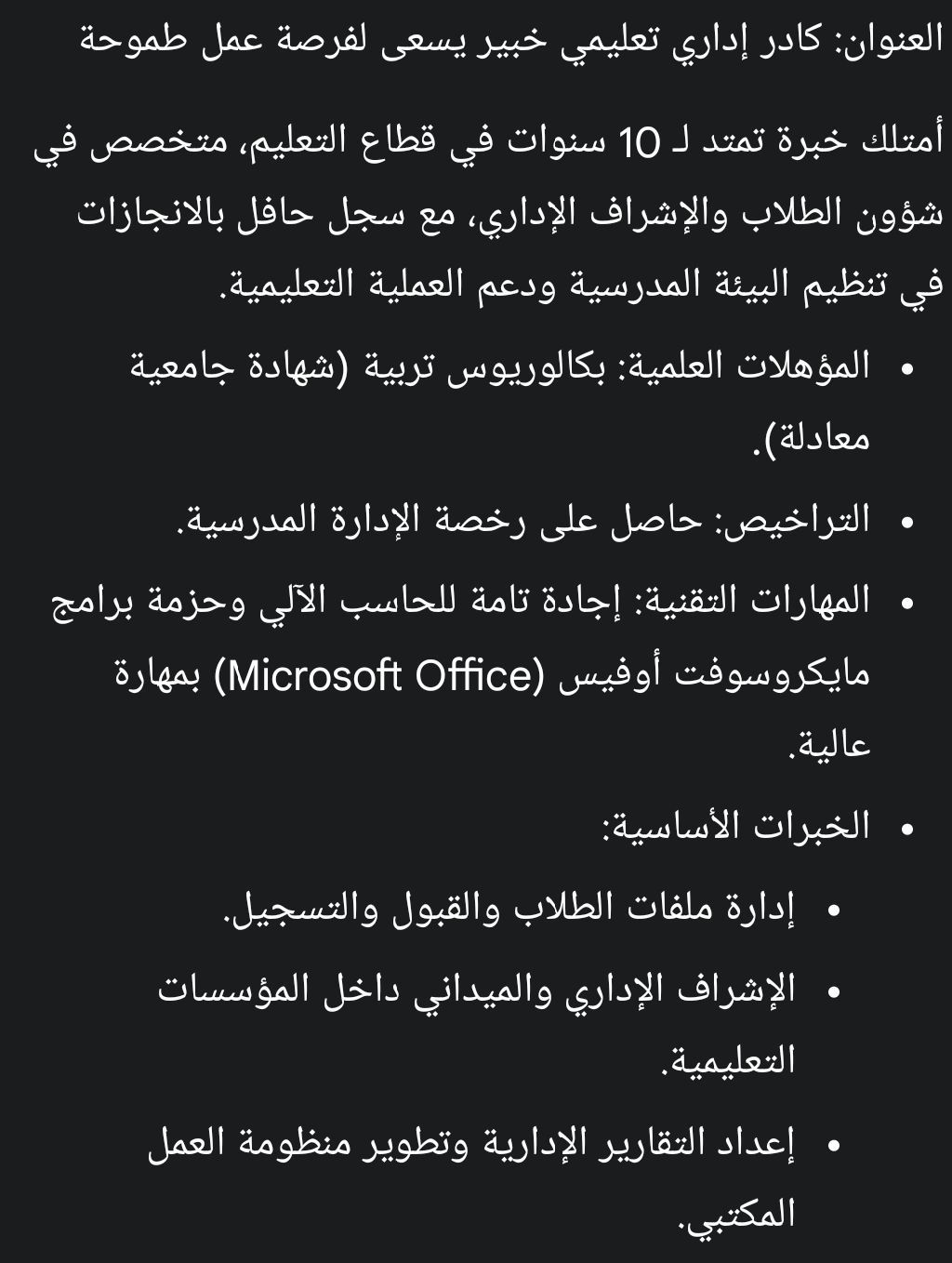 ابحث عن عمل اداري شؤون طلاب أو سكرتير اداري لمدير المدرسة خبرة 10 سنوات حاصل علي بكالوريوس تربية وتم معادلة الشهادة ويوجد رخصة مهنية إدارة مدرسية والباقي في أل CV