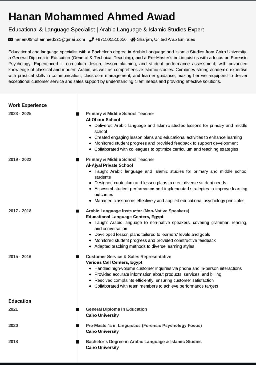 معلمة لغة عربية وتربية اسلامية حاصلة على ليسانس اللغة العربية والدراسات الاسلامية وحاصلة على دبلومة تربوية من جامعة القاهرة هل تبحث عن تأسيس قوي لطفلك في اللغة العربية والتربية الاسلامية هل تريد تحسين القراءة والكتابة أو تعلم التجويد بشكل صحيح أقدم لك تحفيظ القرآن الكريم باحكام التجويد تعليم التجويد بطريقة سهلة ومبسطة تأسيس الاطفال من الصفر في القراءة والكتابة تعليم اللغة العربية لغير الناطقين بها