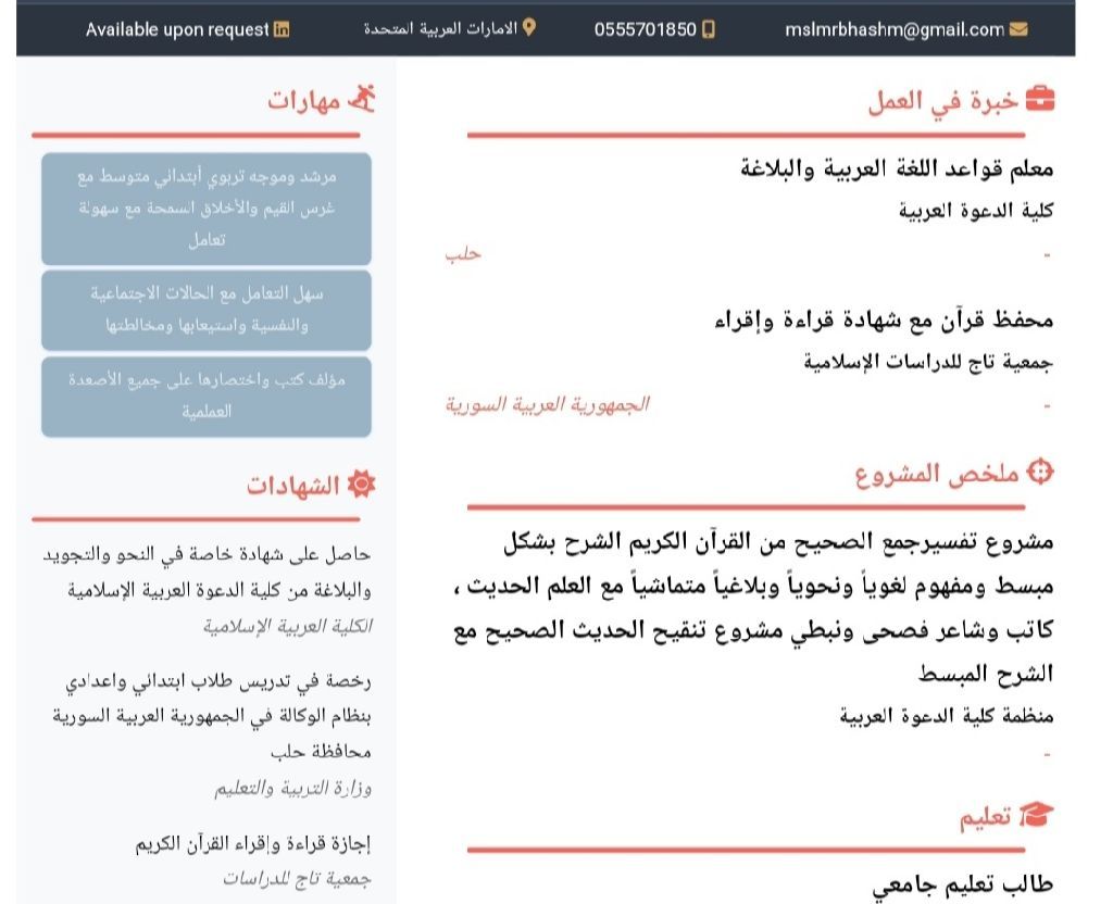 محفظ قرآن برواية حفص من بلاد الشام سوريا حاصل على إجازة إقراء ومدرس طلاب اعدادي وحاصل على شهادة تدريس القواعد العربية والنحو متواجد داخل الدولة