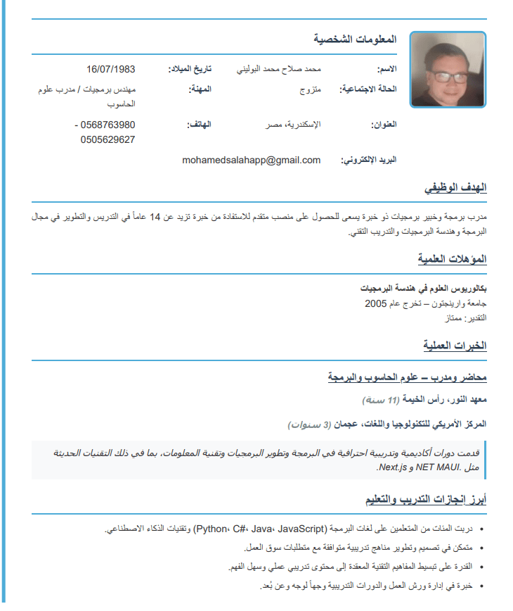 مدرب حاسب آلي بخبرة تزيد عن 14 عاما في مجال التعليم التقني. متخصص في الذكاء الاصطناعي، الأمن السيبراني، برمجة الويب، تطبيقات سطح المكتب والموبايل