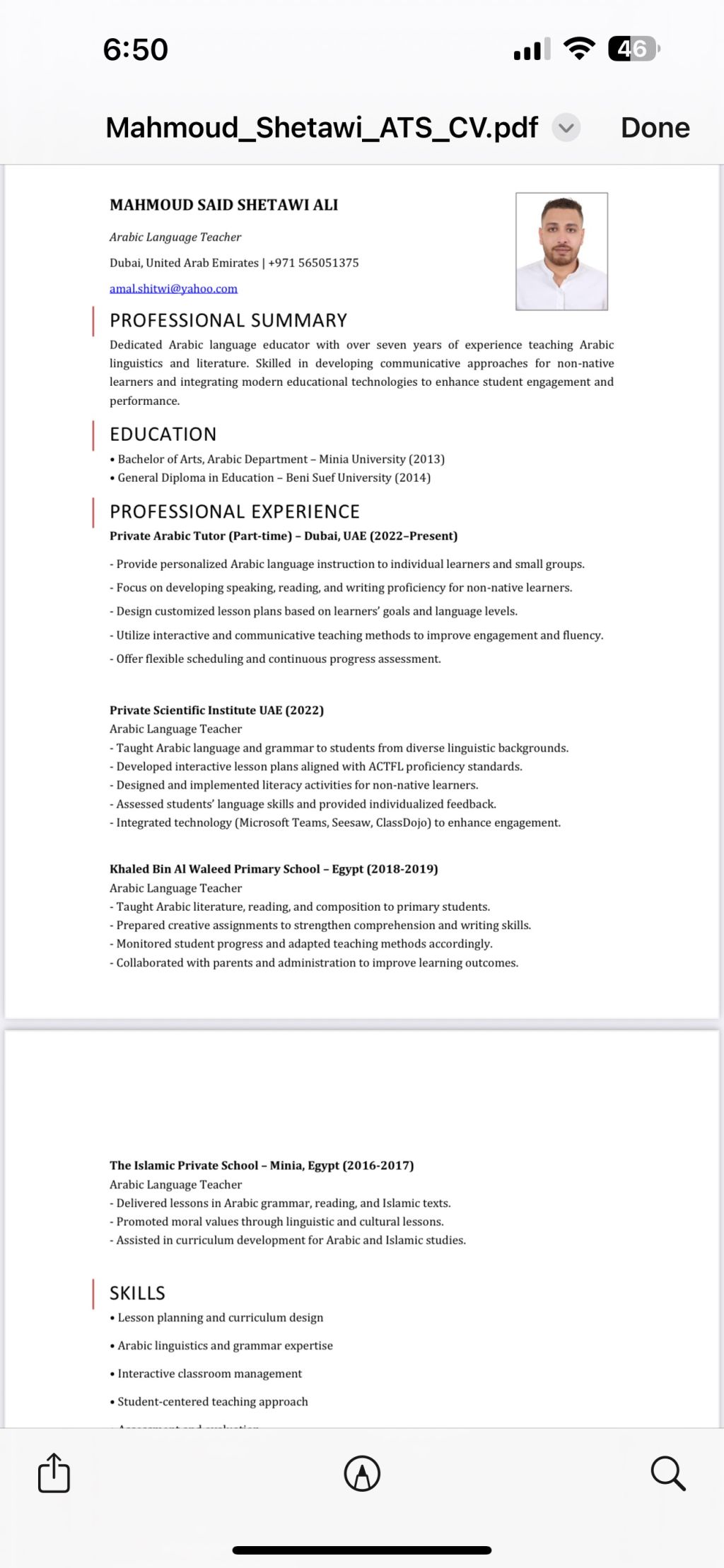 Here is a clear and professional English version I am an Arabic language teacher for both native and non - native speakers. I am currently seeking a job vacancy. I have one year of experience in the United Arab Emirates and two years of experience in Egypt