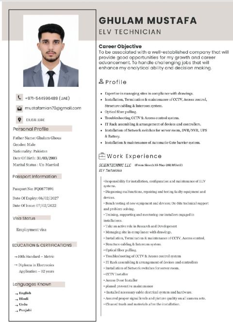 اسمي غلام مصطفى، وابحث عن فرصة عمل في مجال فني أنظمة الجهد المنخفض (تركيب وصيانة واختبار وتكوين الأنظمة) أنا شخص مخلص ومجتهد، وأسعى لتحقيق النتائج، ولدي خبرة أربع سنوات في الامارات العربية المتحدة. أرجو الاطلاع على سيرتي الذاتية المرفقة، وأرجو منكم التكرم بالنظر في طلبي لشغل الوظيفة في مؤسستكم. شكرا لكم على وقتكم واهتمامكم