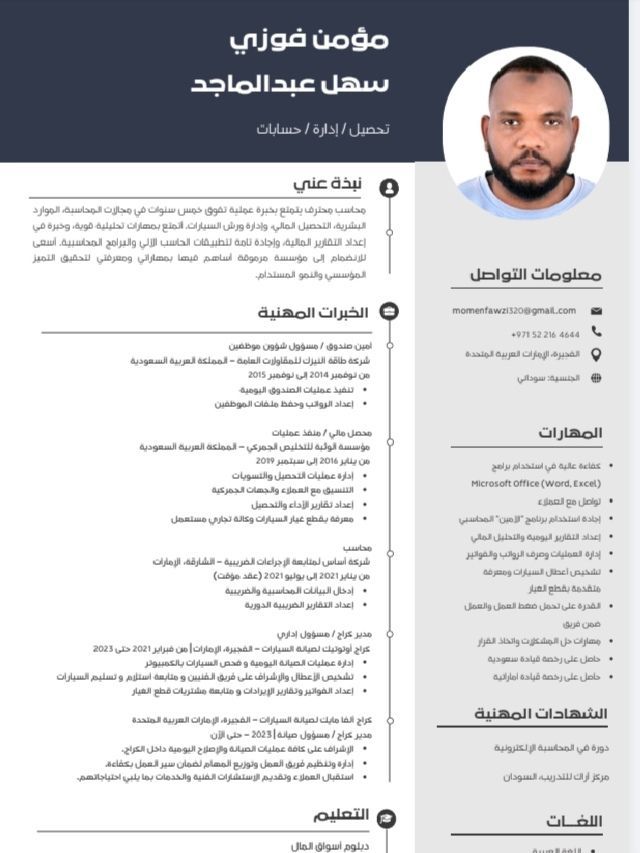 سوداني الجنسية العمر 32 سنة اعمل في مجال ادارة ورش صيانة السيارات خبرة أكثر من 5 سنوات معرفة تامة بمحلات قطع الغيار المستعمل والوكالة والتجاري أتعامل مع جهاز فحص سيارات وتشخيص الأعطال أتحمل ضغط العمل الدفع به الى الأمام العمل بروح الفريق الواحد الاخلاص والأمانة في العمل مجال السيارات هواية وليسه وظيفة بالنسبة لي أحمل إقامة سارية ورخصة قيادة وتصميم سستم محاسبي لتتبع التقراير اليومية والشهريه