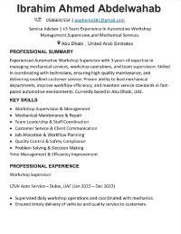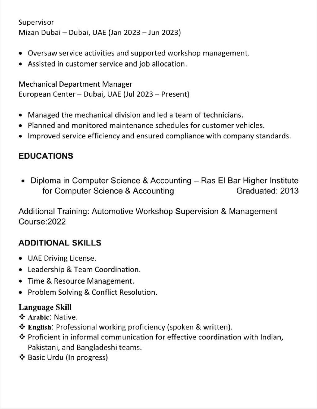 Management, Supervision, and Mechanical Services. Experienced Automotive Workshop Supervisor with 3 years of expertise in managing mechanical services, workshop operations, and team supervision. Skilled in coordinating with technicians, ensuring high - quality maintenance, and delivering excellent customer service. Proven ability to lead mechanical departments, improve workflow efficiency, driving