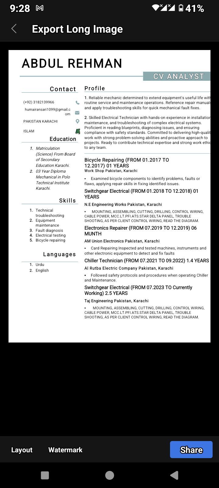 I am looking for a full time job. Have an experience for 6 years + in Switchgear panel manufacture, Panel DB control wiring, chiller operator, Mechanical & Multi - Tasking