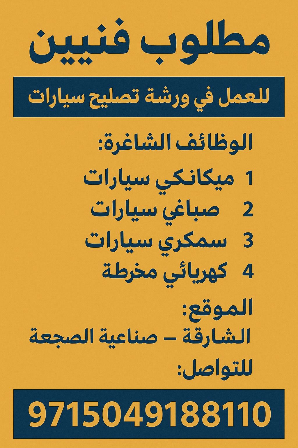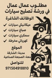 مطلوب فنيين للعمل في ورشة تصليح سيارات الوظائف الشاغرة 1. ميكانيكي سيارات. 2. صباغ سيارات. 3. سمكري سيارات. 4. كهربائي سيارات. 5. فني مخرطة. الموقع الشارقة للتواصل