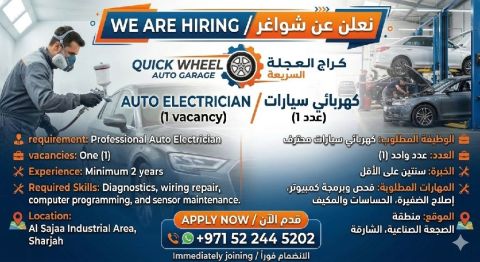 Hiring Professional Auto Electrician Join a leading garage in Al Sajaa Industrial Area, Sharjah. Requirements Minimum 2 years experience. Expert in diagnostics, computer programming, wiring, and AC systems. Location Al Sajaa, Sharjah. Apply via WhatsApp (Click link)