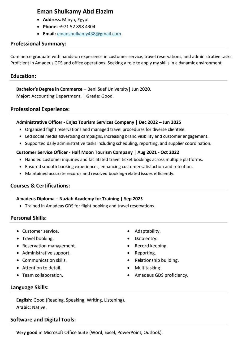 Hello, I am Seeking a full time role in Airline Reservations in the UAE. Experienced in booking, ticketing, PNR changes/ cancellations, and customer handling. Skilled in Amadeus, strong English, and able to work under pressure. Location Ajman Availability Immediate. Thank you for any opportunity