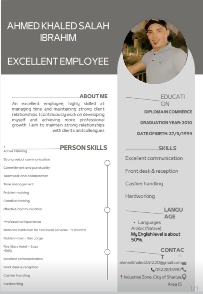 أنا أحمد خالد السن 30 سنة عندي خبرة في شغل الفنادق السياحية وايتر موظف استقبال كاشير حارس أمن أي وظيفة تخص الوظائف الفندقية عندي خبرة فيها واشتغلت أكثر من ثمان سنين في مجال السياحة والفنادق