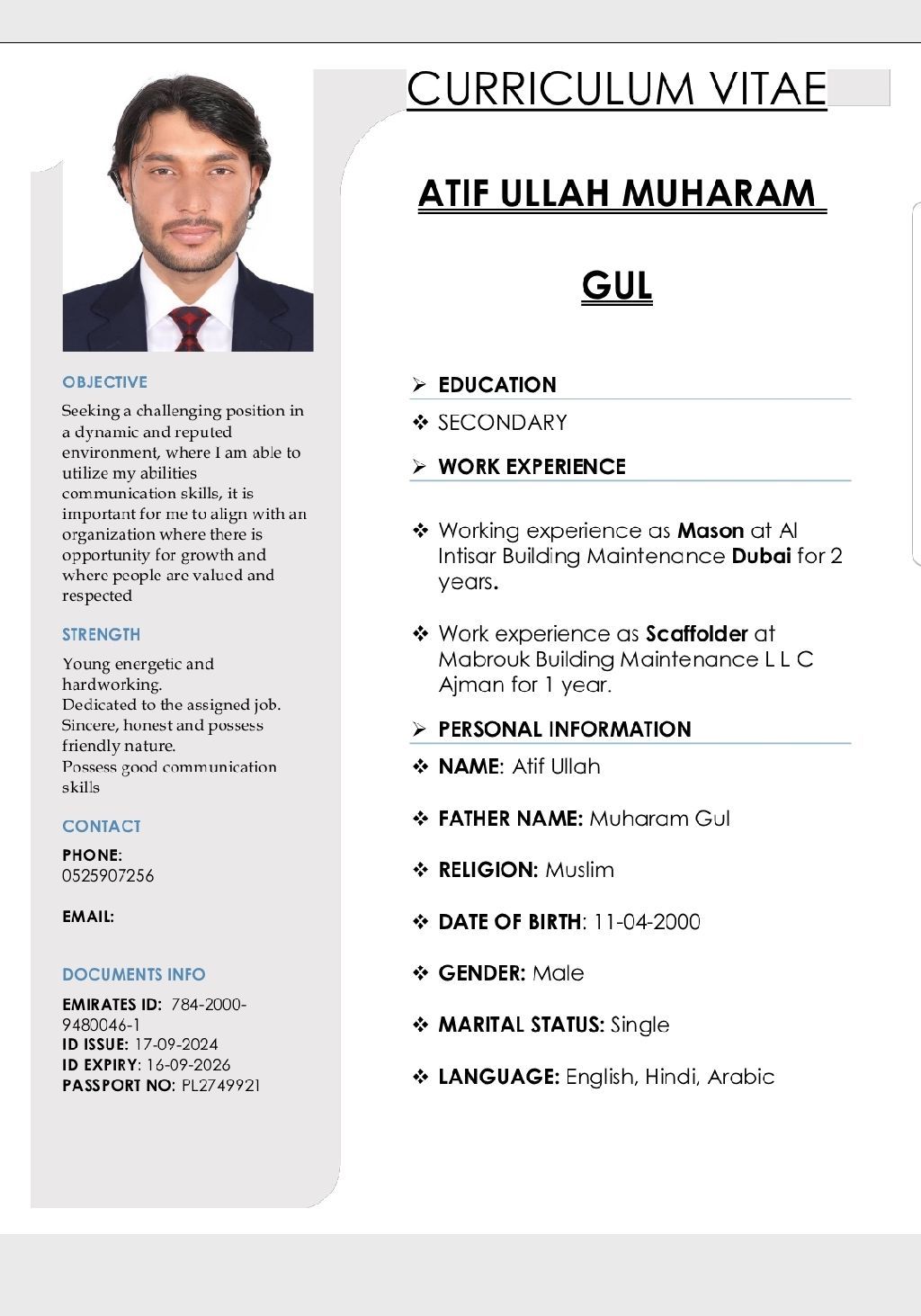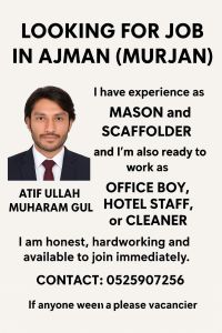 Looking for Job in Ajman (Murjan) I have experience as Mason and Scaffolder, and I am also ready to work as Office Boy, Hotel Staff, or Cleaner. I am honest, hardworking, and available to join immediately. Contact If anyone needs a worker, please feel free to contact me
