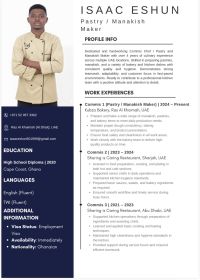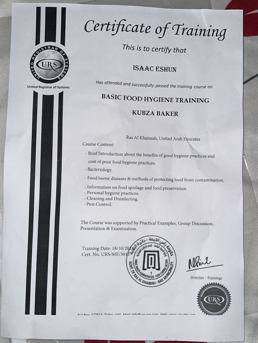 My name is Isaac Eshun. Nationality Ghana, 26 years old. I have 4 years experience in baking (manakish) and a food hygiene certificate holder. Currently in Ras Al-Khaimah