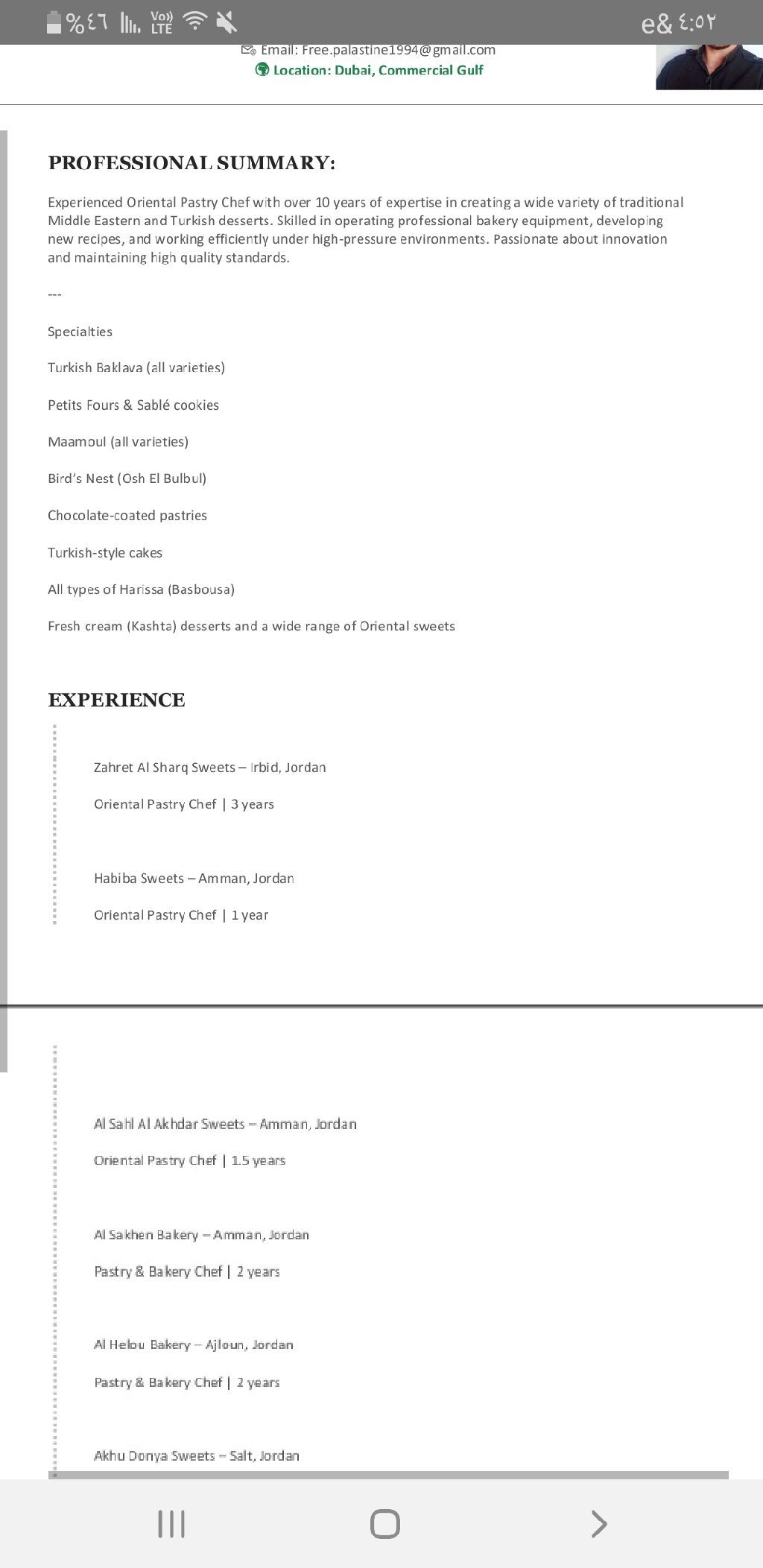 شيف حلويات شرقية وغربيه امكانية عمل أصناف متعددة ويوجد أفكار لأصناف جديدة من ابتكاري خبرة في مجال الحلويات 13 عام ما بين العمل في سوريا والأردن وابحث عن وظيفة الآن داخل الامارات