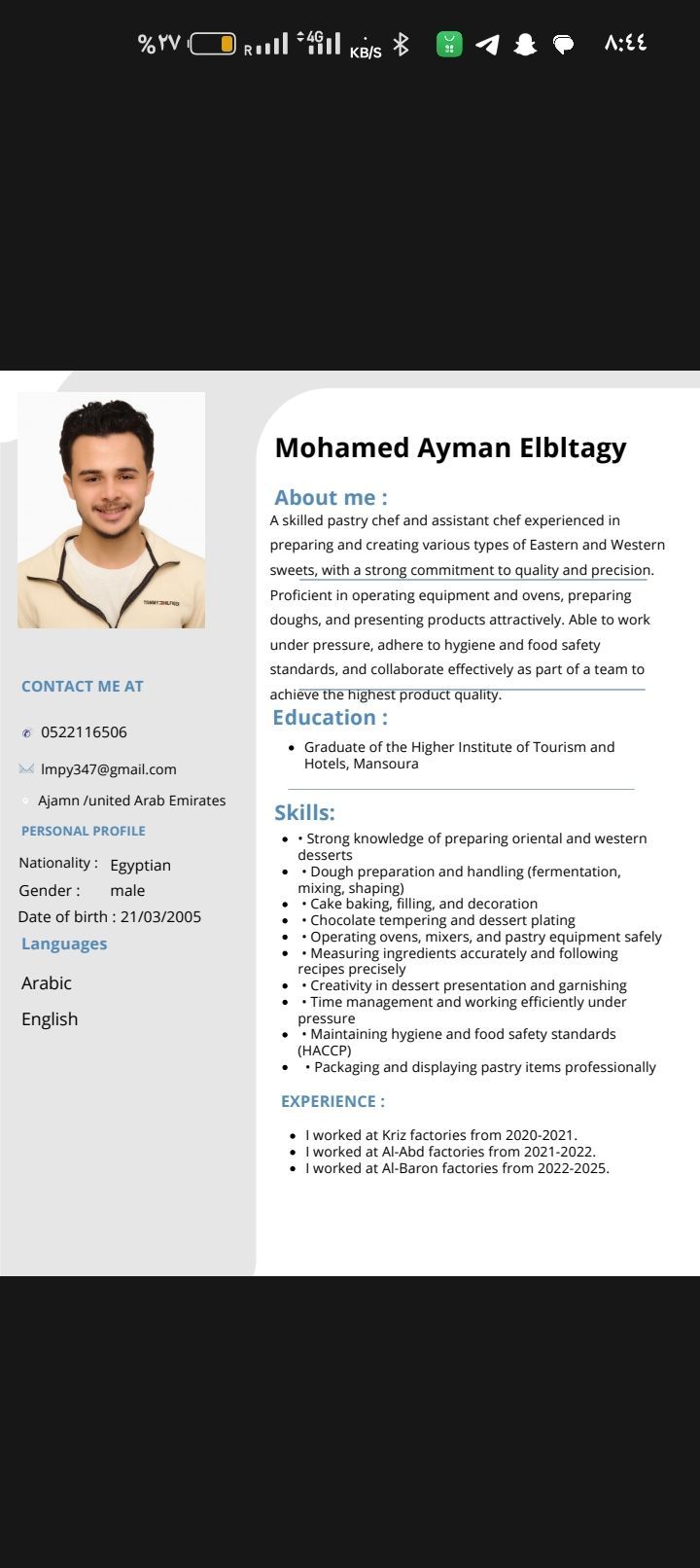 محمد أيمن محمد البلتاجي مساعد أول شيف غربي (First Assistant Western Chef) الجنسية مصريه خبرة خمس أعوام (Five years of experience) حاليا في عجمان وابحث عن وظيفة في مجال الحلواني السن 22 عام ملتزم بالعمل وبالنظافة المكان ونشيط في عملي