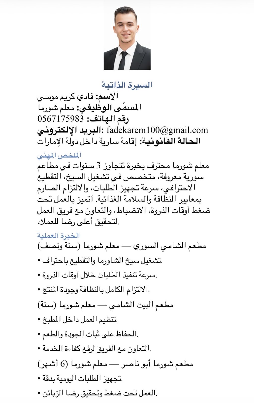 شاورما محترف بخبرة أكثر من 3 سنوات داخل مطاعم سورية معروفة في دولة الامارات. أجيد تشغيل السيخ والتقطيع باحتراف، سرعة تنفيذ الطلبات، والالتزام بالنظافة والسلامة الغذائية. خبرة في العمل تحت ضغط أوقات الذروة والتعامل الجيد مع فريق العمل. إقامة سارية - متاح للعمل فورا للتواصل