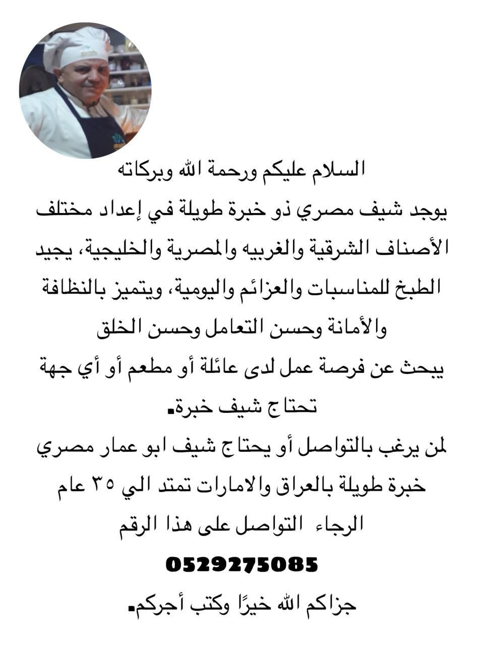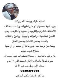 شيف مطبخ مصري عام سخن خبرة أكثر من 35 عام في الامارات والعراق ومصر والأردن، الإقامة سارية وجاهز للاعارة
