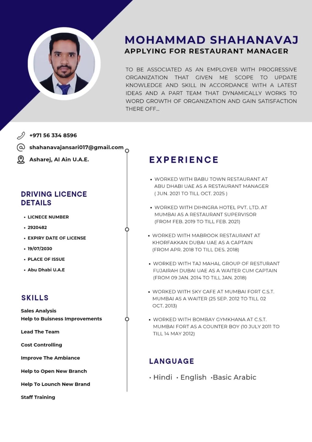 I am looking job I have 13 years experience in hospitality industry I have 4 years experience in restaurant manager and I am looking same position or restaurant supervisor I have own visa and own car and license I am available to join any time my contact number Thankyou