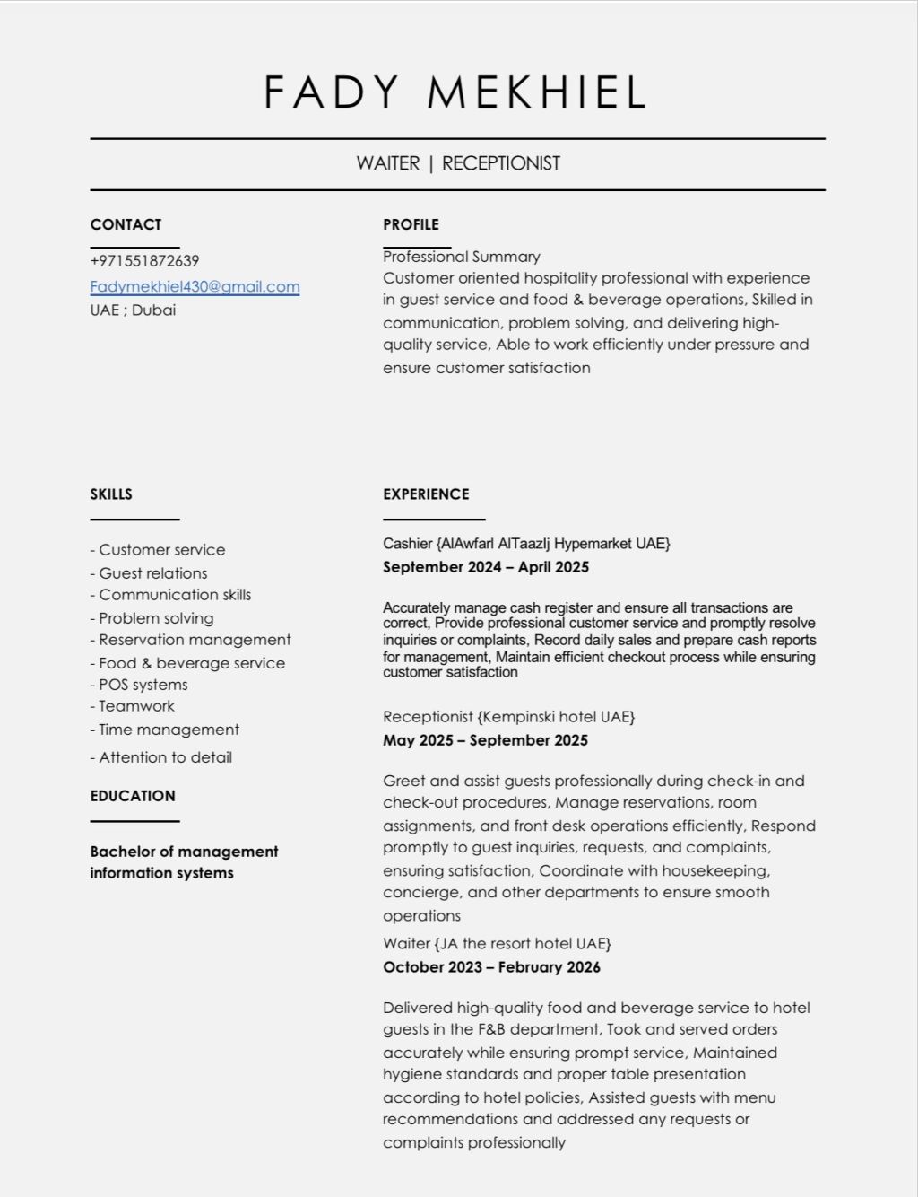 شاب مصري موجود في دبي من سنتين ابحث عن عمل اشتغلت في عدة مجالات (سوبرفايزر كاشيرات - ريسبشن في هايبر ماركت كبير) وايتر في كذا فندق من فنادق شارع الشيخ زايد وجبل علي حاليا مكنسل إقامة ومعيا فترة سماح وحاليا بخلص في آخر اجراءات رخصة القيادة