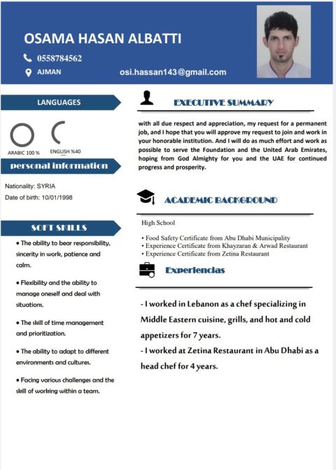 أنا شيف مطبخ شرقي مختصص في الطبخ الشرقي والمشاوي والمقبلات الباردة والساخنه خبرة 11 سنوات في الامارات عربي ولبناني