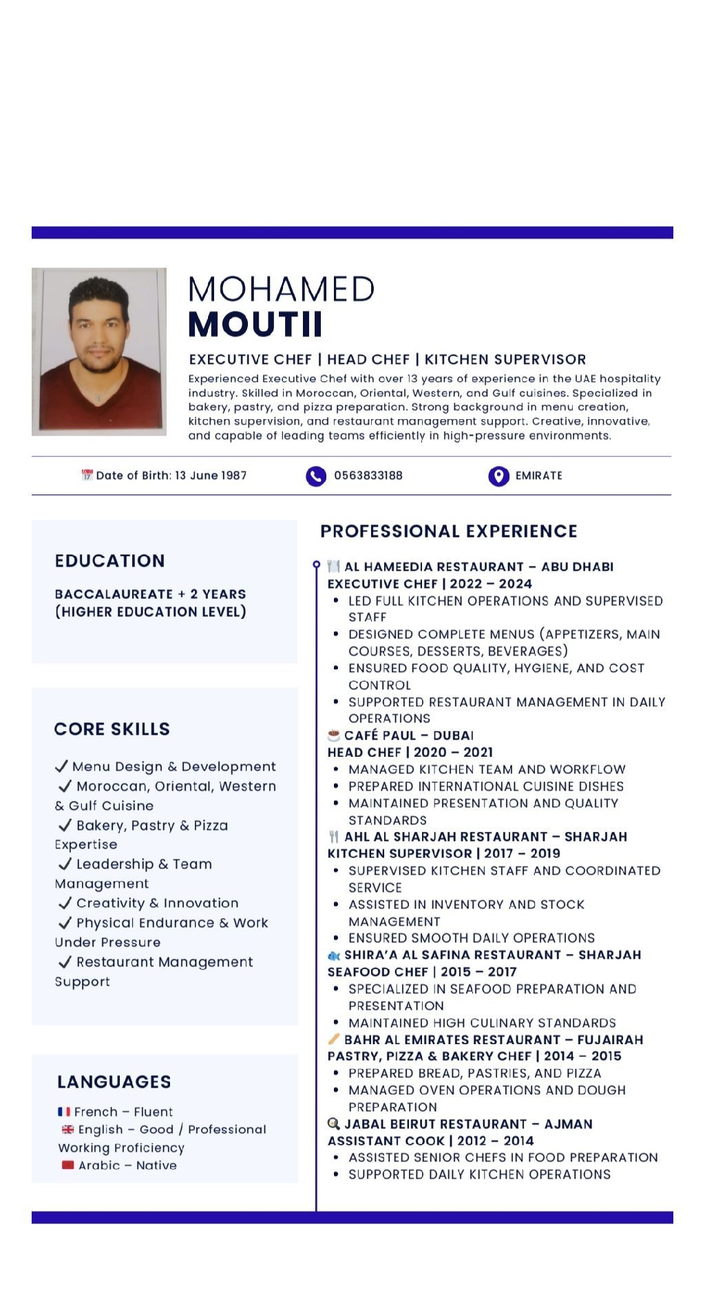 شيف مغربي عام. 38 سنة شيف شرقي. غربي. خليجي. مغربي. خبرة 13 سنة في الامارات. تجديد قائمة الطعام وتطويرها، قيادة المطبخ وتسهيل العمل الجماعي. الانظباط. مهني. شيف بيتزا ومعجنات. شيف رز بكل أنواعه. شيف مأكولات بحرية. شاورما. مقبلات. سلطات. عصاير