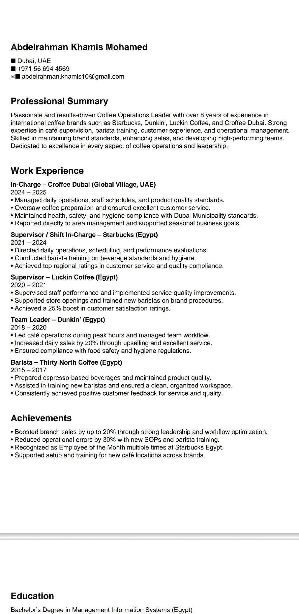 I am a supervisor in the cafe industry with 8 years of experience and I am looking for a job as a supervisor