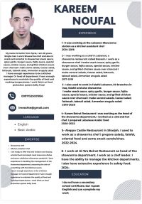 معلم شاورما، شك وقشر وتتبيل (لحمة ودجاج) شيف ساخن، اعداد السندويشات اعمل سلطات وبارد احضر الحمص والمتبل والفلافل، وأجيد عمل الثوم (الصوص) أنا من سوريا، عمري 29 عاما، ابحث عن عمل