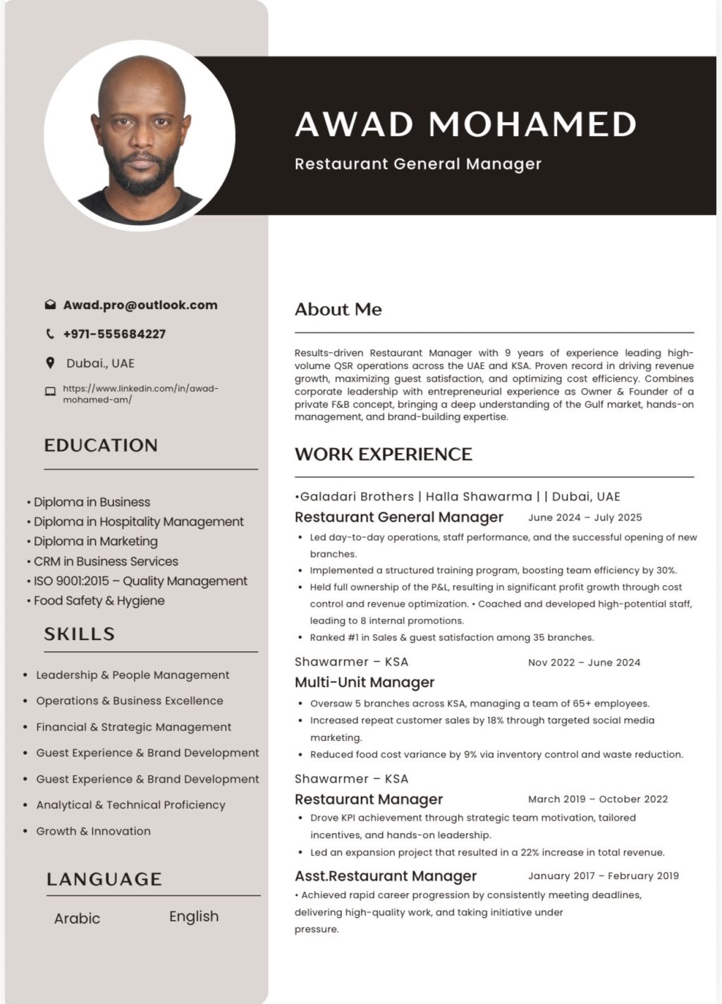 متخصص ادارة المطاعم خبرة في إدارة فروع متعددة خبرة 9 + سنوات في إدارة عدة فروع وتحقيق زيادة المبيعات، جذب العملاء، وتنفيذ الحملات التسويقية الامارات جاهز فورا