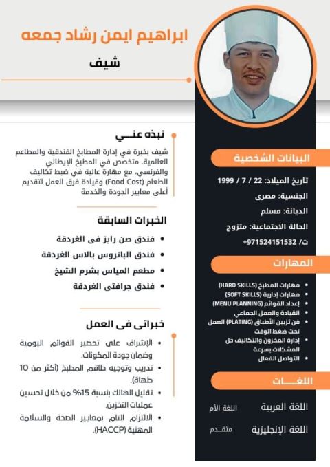 أنا شيف سخن وشيف مشويات ومساعده شيف شاورما وإقامة قابلها للاعارة