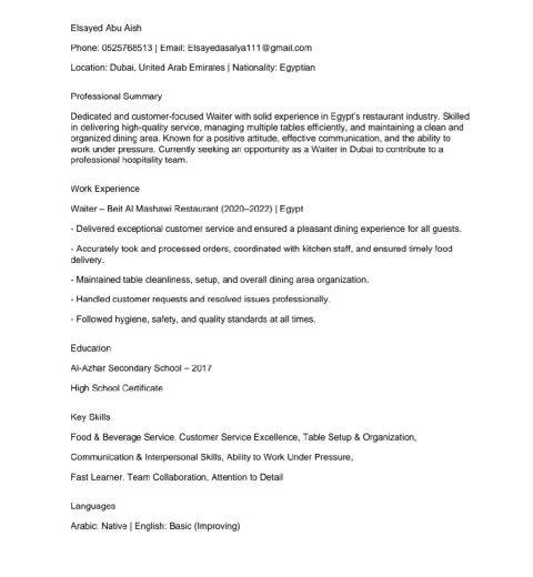 OpenToWork for the Senior WaiterHead Waiter position bringing solid experience from Emirates Flight Catering at Dubai International Airport where I worked in First Class Lounge as well as at Crab Market Living Room Restaurant Lounge Through these roles I developed strong guest service skills teamwork and the ability to maintain high standards in fast - paced Luxury environments (4000 salary expec)