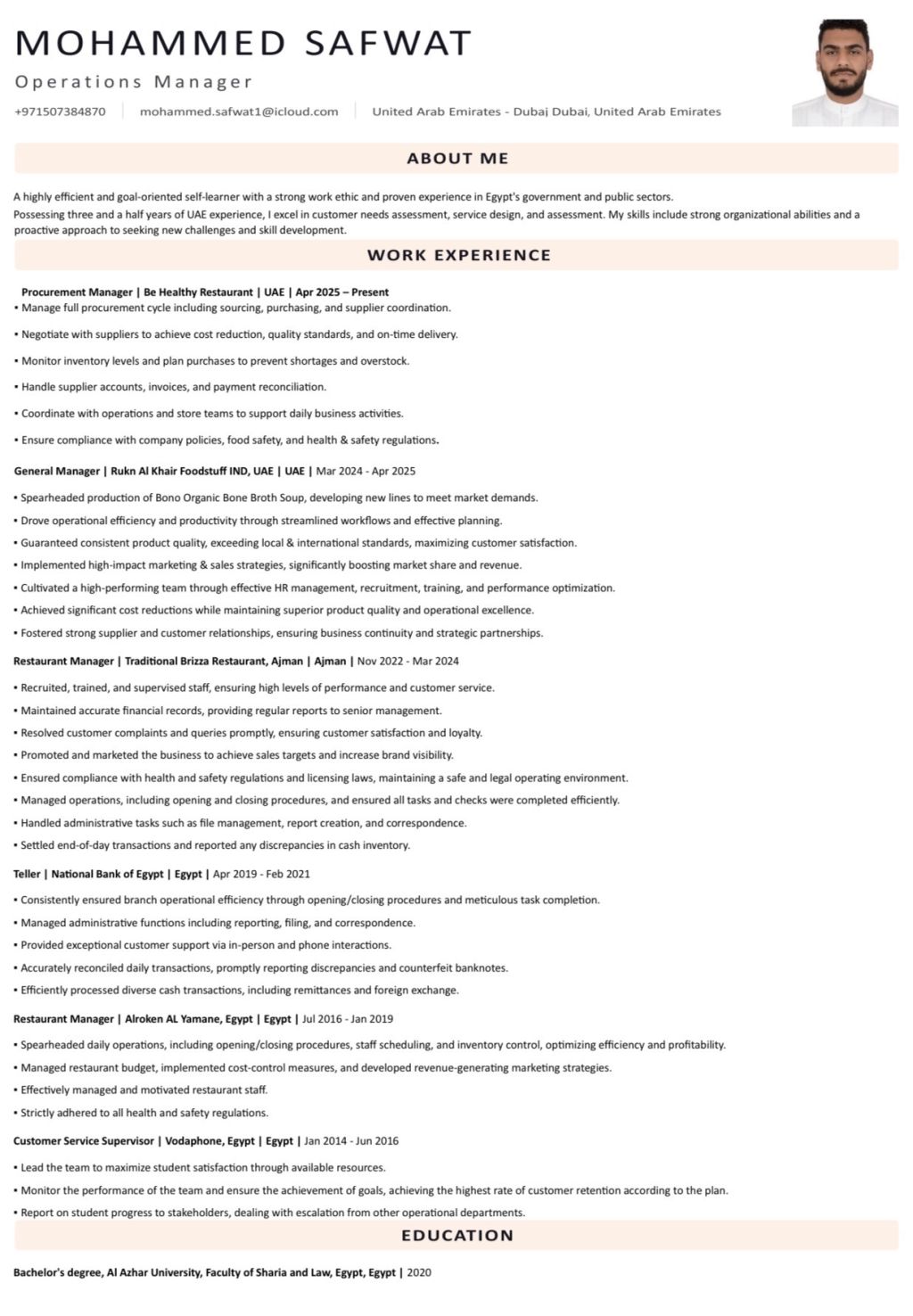 I am Mohamed Safwat, an Egyptian in Dubai, seeking a job in project management, accounting, and business administration. I have experience in the UAE and a valid UAE driving license. I also have strong expertise in managing restaurants and traditional kitchens, having opened and operated multiple restaurants in Ajman and Abu Dhabi. Ready to join immediately