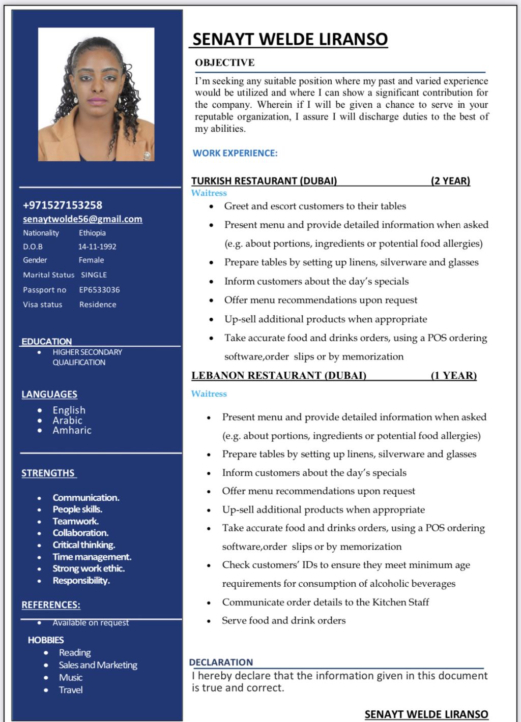 Am looking a waitress job 3 years experience with English Arabic Indian Turkish and Amharic languages