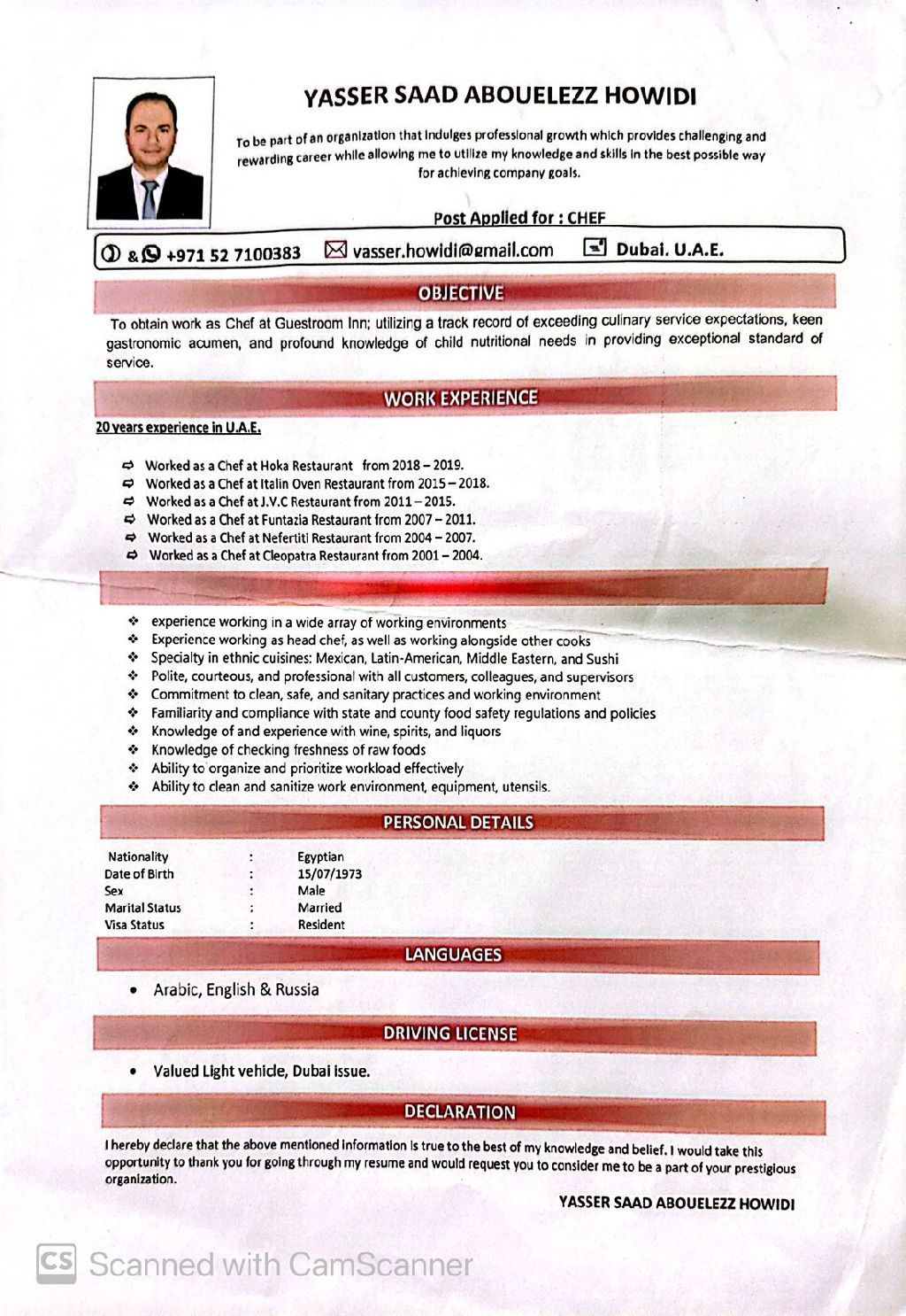 A Lebanese Chef specializing in Lebanese and Mexican Shawarma, meat, all kinds of grilled, appetizers, Lebanese and Iraqi kibbeh, cooking, fast food, License, car, English language required