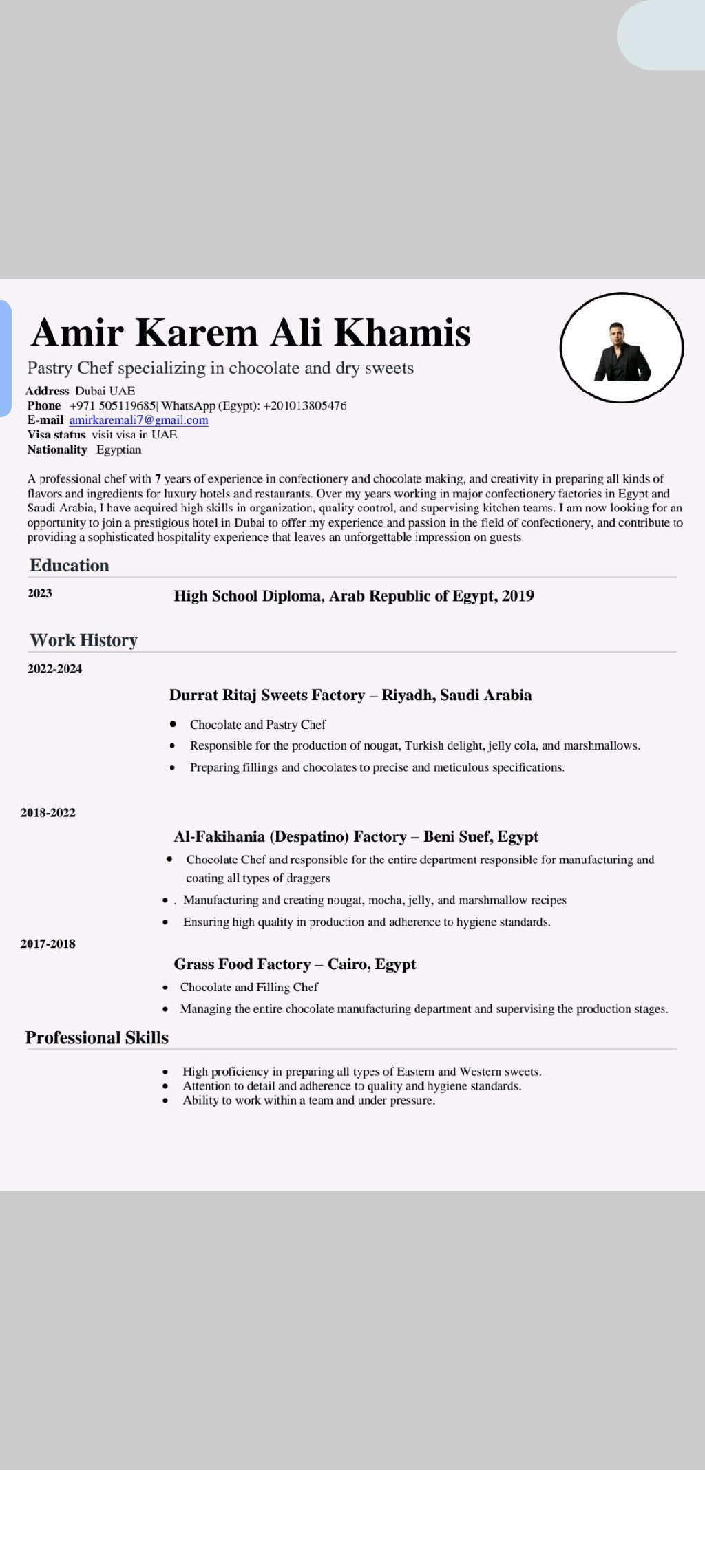 أنا شيف شوكولاته وحلويات جافه مثل الحلقوم والنوكا والجيلي كولا والمار شم يلوا وجميع أنواع ألد راجية وطبخ جميع أنواع الاسبريد وطبخ جميع الشوكولاته حار وبارد وأجيد تحميص أنواع المكسرات والقهوة متواجد في دبي