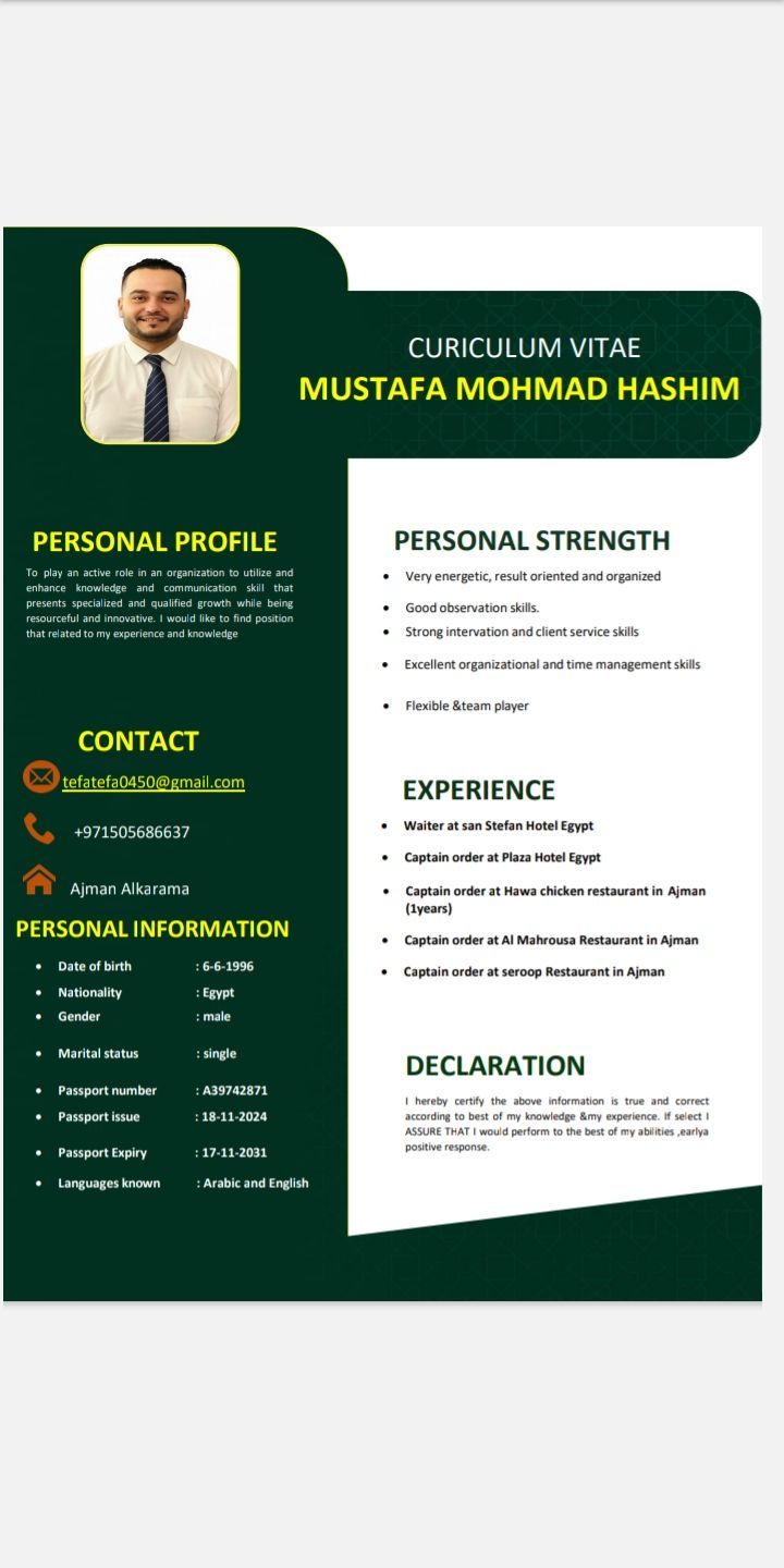 ابحث عن عمل وايتر أو كابتن اوردر خبرة في مجال المطاعم والكافيهات وخبرة سنة ونصف في الامارات