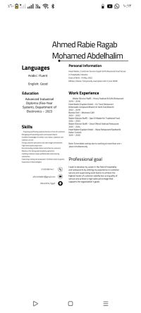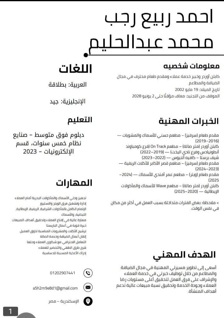 أنا شاب 23 سنة اعمل في مجال المطاعم بقالي 11 سنة اشتغلت سنتين باريستا وسنتين وايتر و5 سنين كابتن اوردر ودي آخر حاجة اشتغلتها على دراية كاملة بالمنيو الإيطالي والشرقي والأسماك وأعرف اخلي جميع أنواع السمك أمام العميل على الطاولة أنا زيارة عايز مكان يعمل إقامة زيارتي فاضل عليها 34 يوم وتنتهي