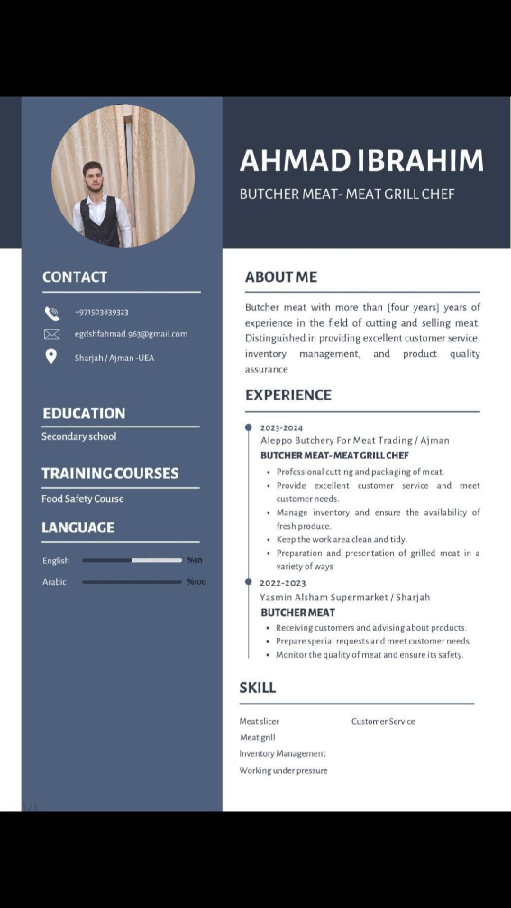 شاب سوري من حلب لدي خبرة ثلاث سنوات من داخل دولة الامارات شيف مشاوي معلم لحام وزائد لحم بعجين الحلبي