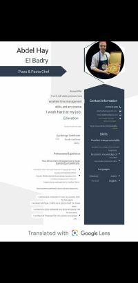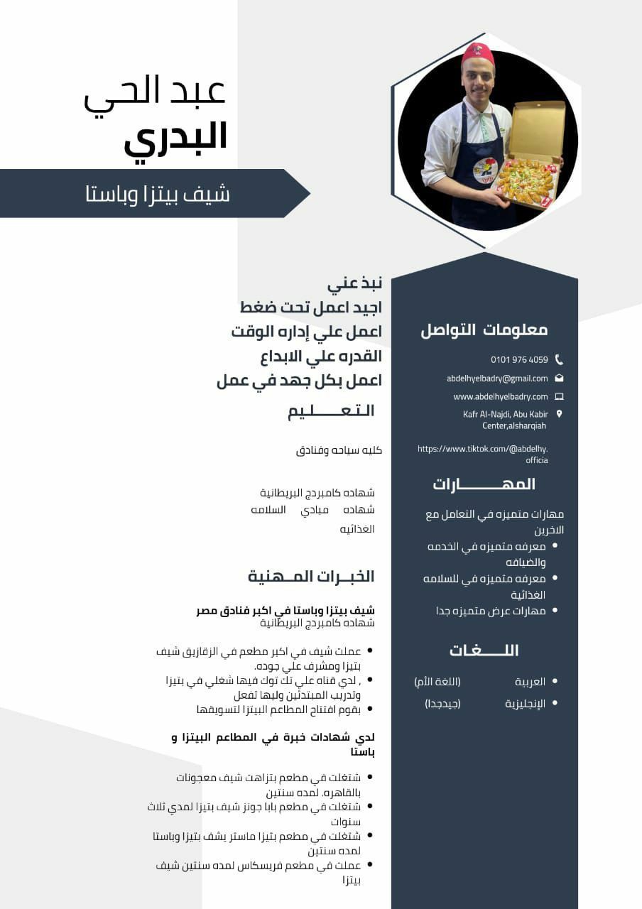 My name is Abdel Hay, I am in Egypt and I am looking for work in the sister country of the Emirates. I am a graduate of tourism and hotels. I speak English and I am a skilled chef of pizza, crepes, pasta and grills