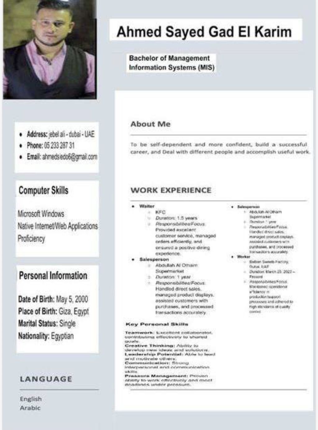 أنا أحمد من مصر عندي 25 سنة خريج نظم معلومات معيا إقامة أنا شغال في مصنع بالبن في دبي في جبل علي الصناعية وبدور على شغل ثاني أفضل ياريت اللي عنده أي شغل ليا يكلمني