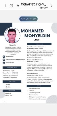 أنا محمد من مصر طباخ شعبي اماراتي ويمني أستطيع أن اعمل تحت ضغط العمل وسريع التحضير الوجبات مثل مجبوس لحم ودجاج ومدفون لحم ودجاج ومخمود لحم وبرياني لحم ودجاج وزربيان لحم ودجاج وحنيذ وجميع أنواع العيوش والفواله الاماراتية مثل الهريس والعريسيه والمضر وبه والساقوا والعصيده ضحين والعصيده بوبر والبلاليط وخبيصه واللقيمات وجميع أنواع القلبات اليمنيه