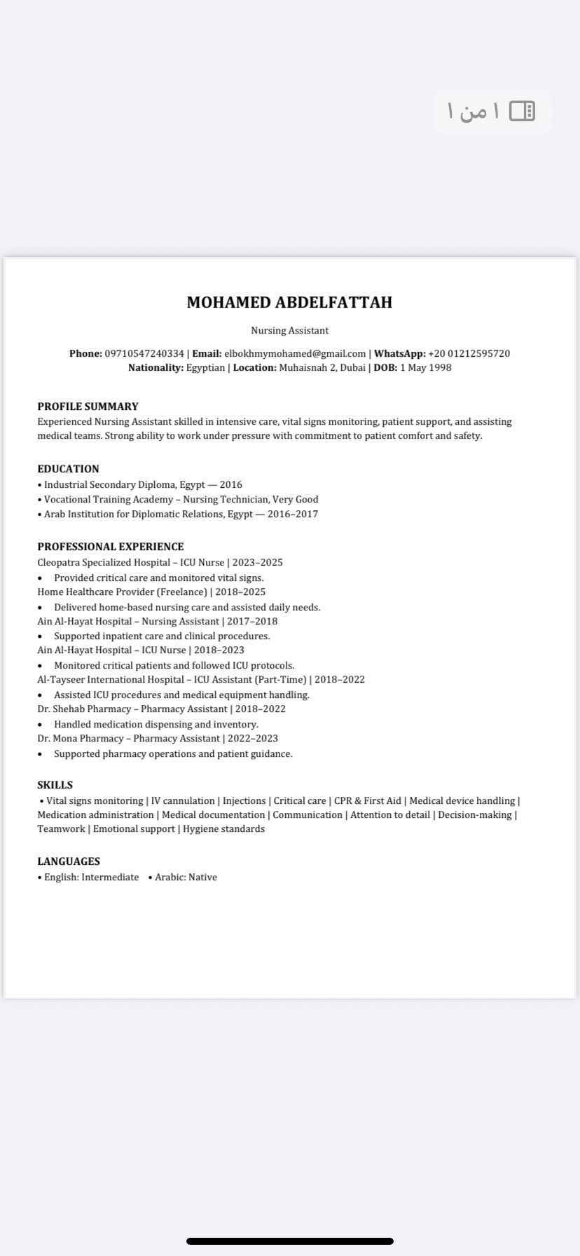 أنا محمد من مصر العمر 28 سنة متواجد في الامارات زيارة وابحث عن عمل داخل الدولة أنا كنت اعمل في مجال التمريض في مصر ولعدم الاعتراف الدولة بالمعهد الخاصه ابحث عن عمل في أي مجال بعيدا عن مجال المعمار وشكرا لحضرتكم