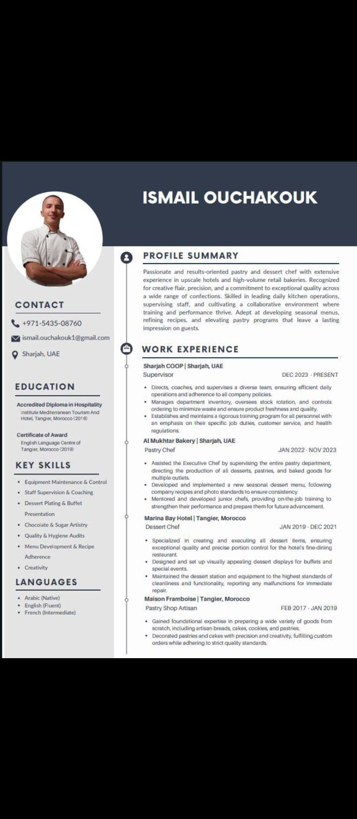 I am Ismail from Morocco, I work in French cake Croissants, Moroccan sweets, cake design I have nine years of experience