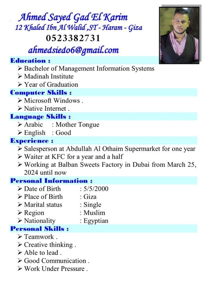 أنا أحمد من مصر عندي 26 شغال في مصنع بالبن للحلويات وبدور على شغل أفضل ياريت اللي يكون عنده شغل يكلمني