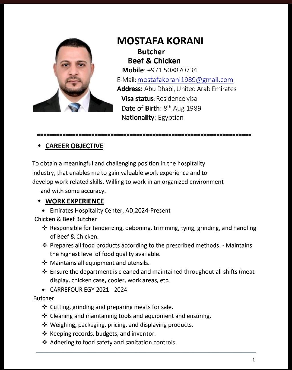 A highly experienced and skilled butcher, I currently work at Abu Dhabi Hospitality Centre, where I am responsible for preparing and processing meat according to the highest international quality standards. I possess exceptional precision in slicing and cutting, while strictly adhering to global food safety regulations (HACCP) to ensure the delivery of premium products worthy of the hospitality in