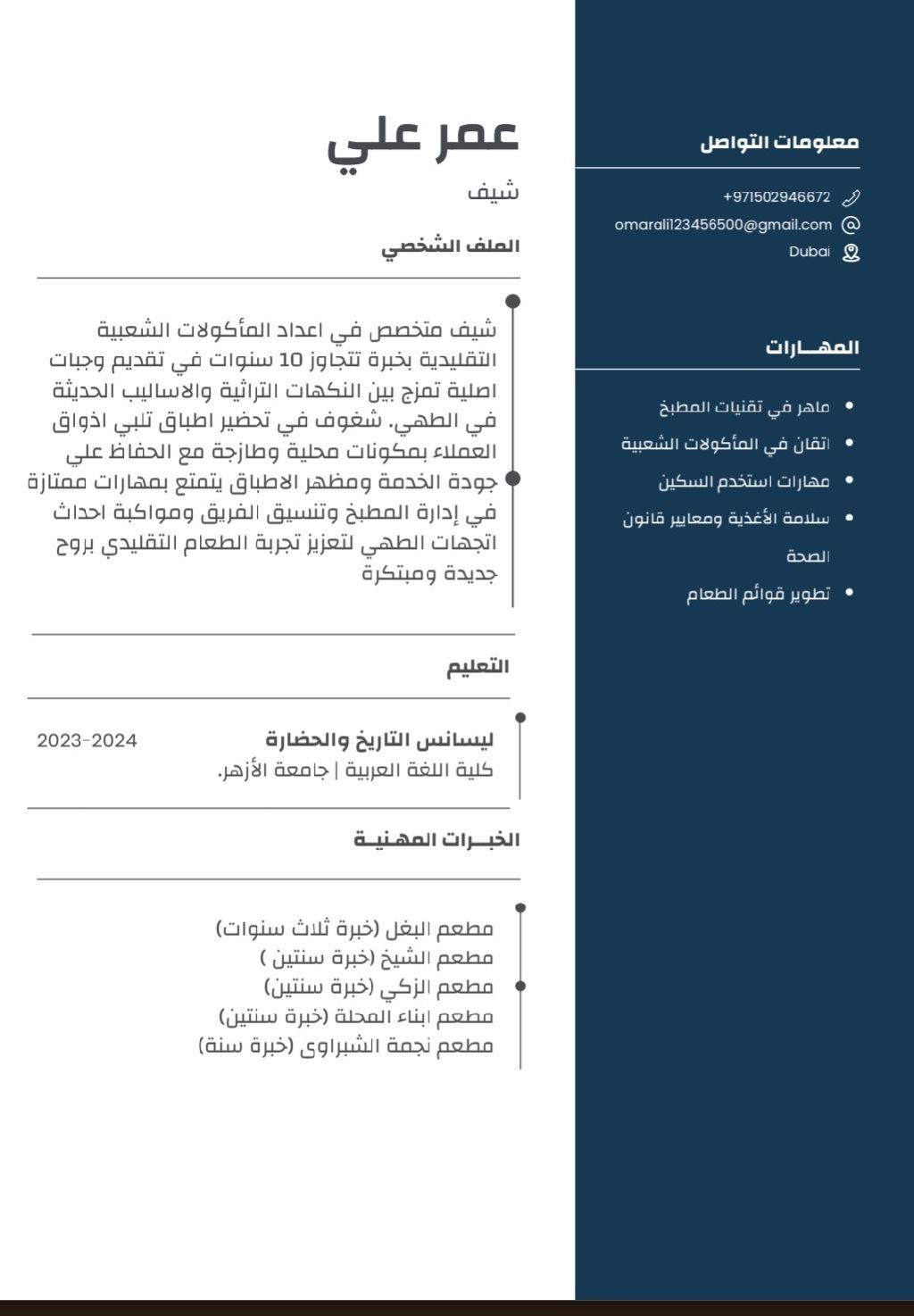 شيف فول وفلافل ابحث عن عمل في إمارة دبي عملت في عدة مطاعم ولدي خبرة تتجاوز من 7:10 سنوات موجود ب دبي