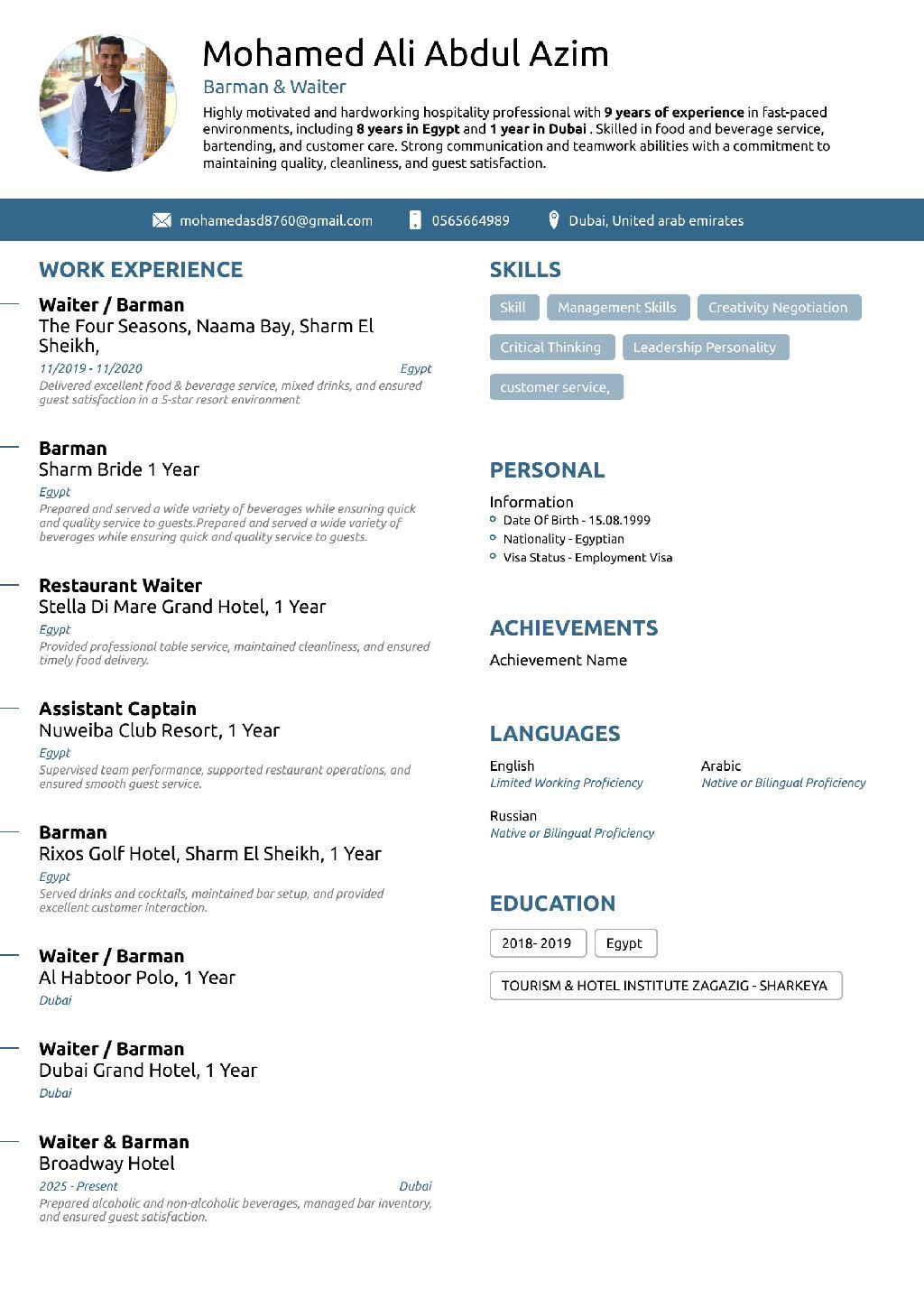 ByI speak English and RussianMy experience in the food and beverage industry includes bar cocktails, French cocktails, and alcoholic beverages