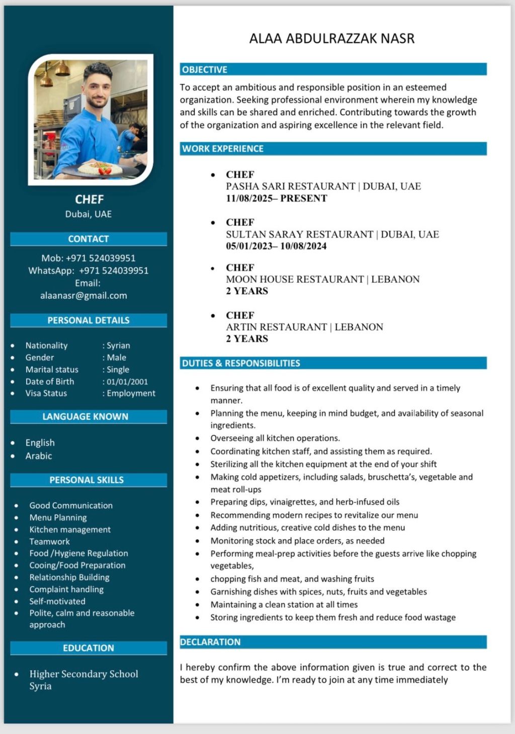 Chef cook with 7 years of experience working in Arabic, Western and Turkish food. I am looking for a job as a general chef in Dubai