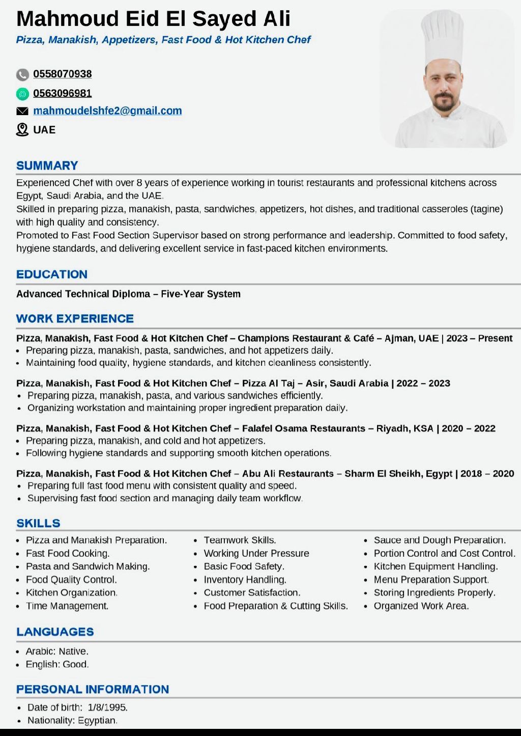 Chef. Pizza. Manakeesh. Appetizers. Pasta. All kinds of sandwiches. Based in the UAE with over 8 years of experience in the restaurant and hospitality industry in Saudi Arabia, the UAE, and Egypt. Seeking a good job opportunity