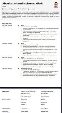 ابحث عن فرصة عمل waiter وايتر موجود إقامة خبرة داخل الدولة 3 سنين في مجال المطاعم